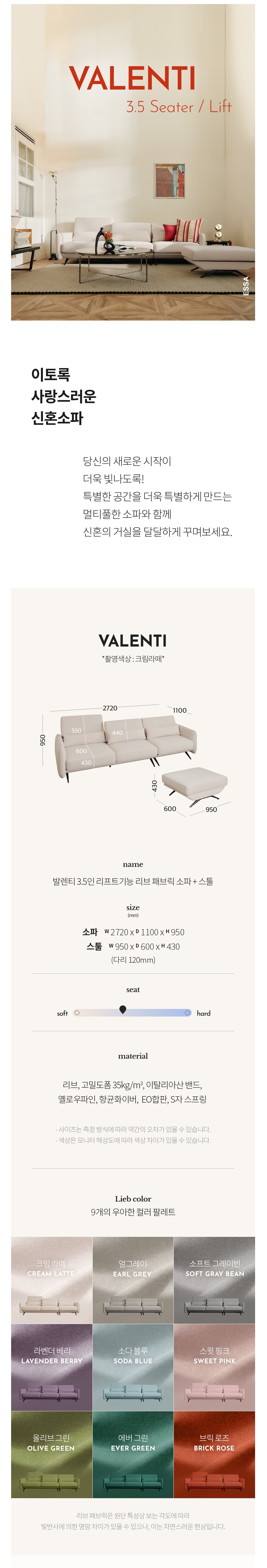 에싸 발렌티 3.5인 리프트기능 리브 패브릭 소파 + 스툴