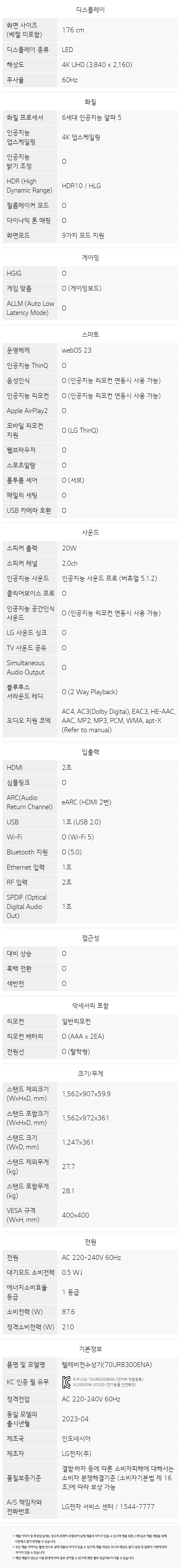 LG전자 2023 LED 울트라 HD 4K 177cm (70UR8300ENA)