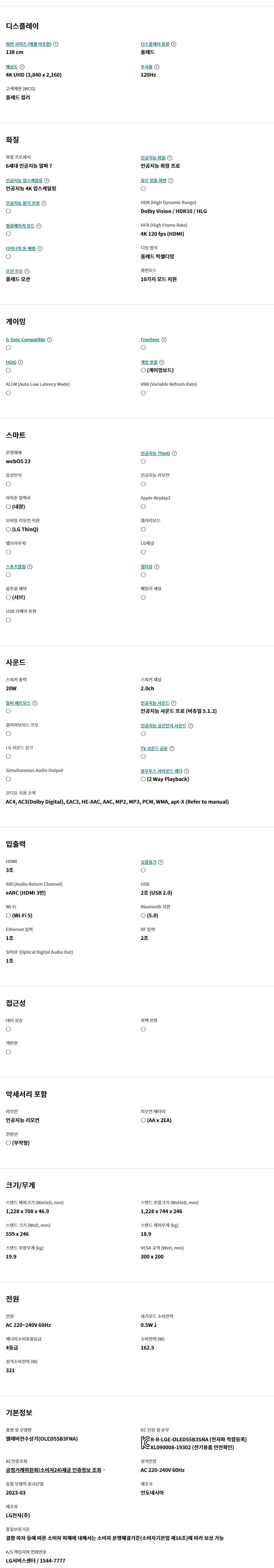 LG전자 2023 올레드 4K 138cm (OLED55B3FNA)