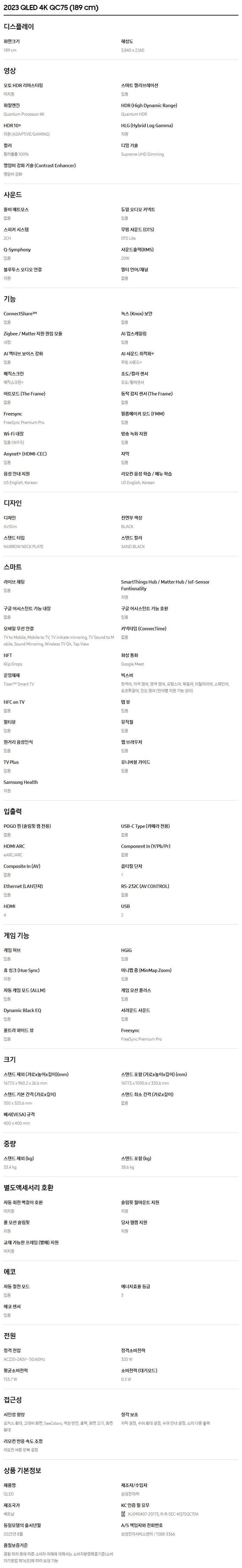 삼성전자 삼성 2023 QLED 4K QC75 189cm (KQ75QC75AFXKR)